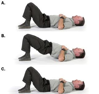 - Стегнете коремните мускули и бавно повдигнете таза нагоре докато тялото и бедрата заемат права линия