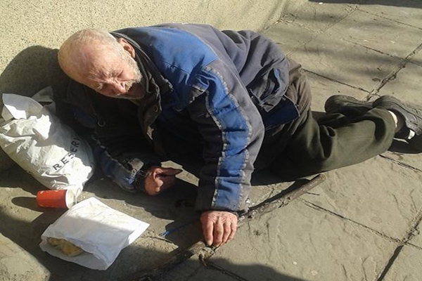 ,която заварих пред магазинчето бе този бездомен човечец ,паднал ,че му призляло