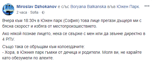 Вчера към 18:30ч в Южен парк (София) това лице прегази дъщеря ми с бясна скорост и избяга от местопроизшествието.