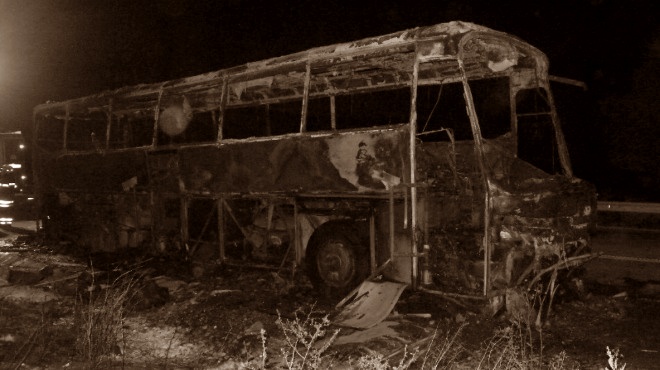 На излизане от Горна Оряховица автобусът се блъска в камион. Избухва в пламъци.