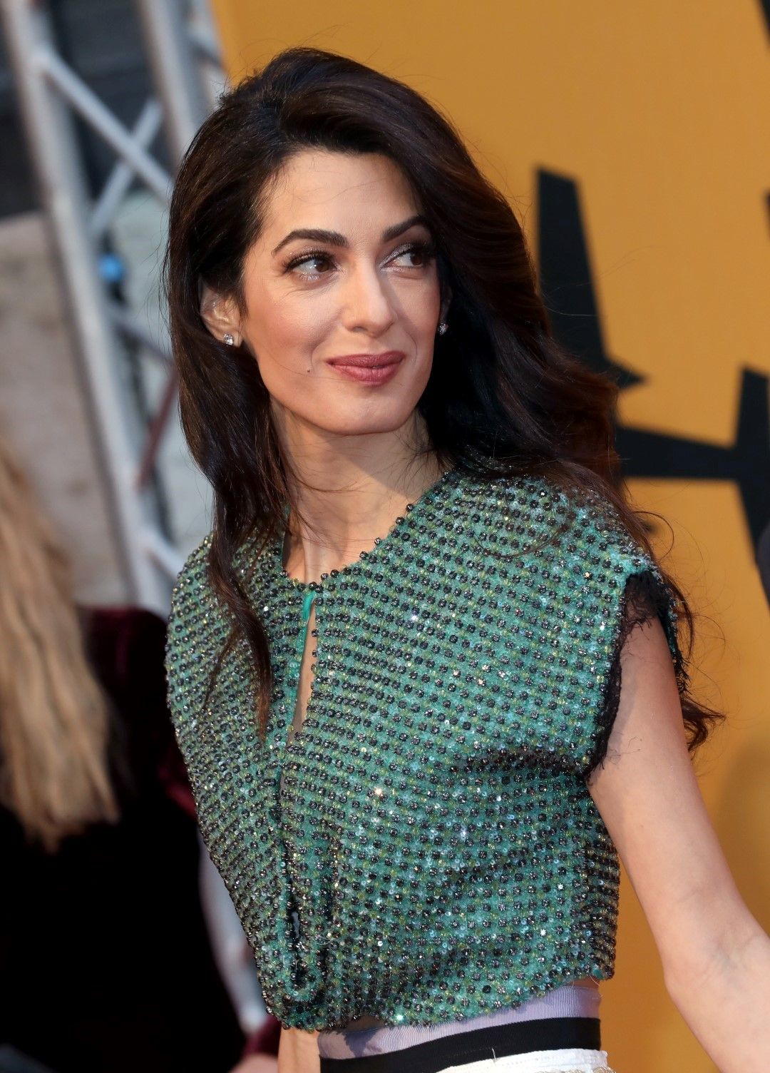 Амал бе избрала модерна, но по-скоро ежедневна визия за проявата, която съчетаваше права пола в цвят шампанско и изумруденозелен топ с паднал ръкав. И двете части бяха богато декорирани с лъскави елементи, така че придаваха официална визия на тоалета.