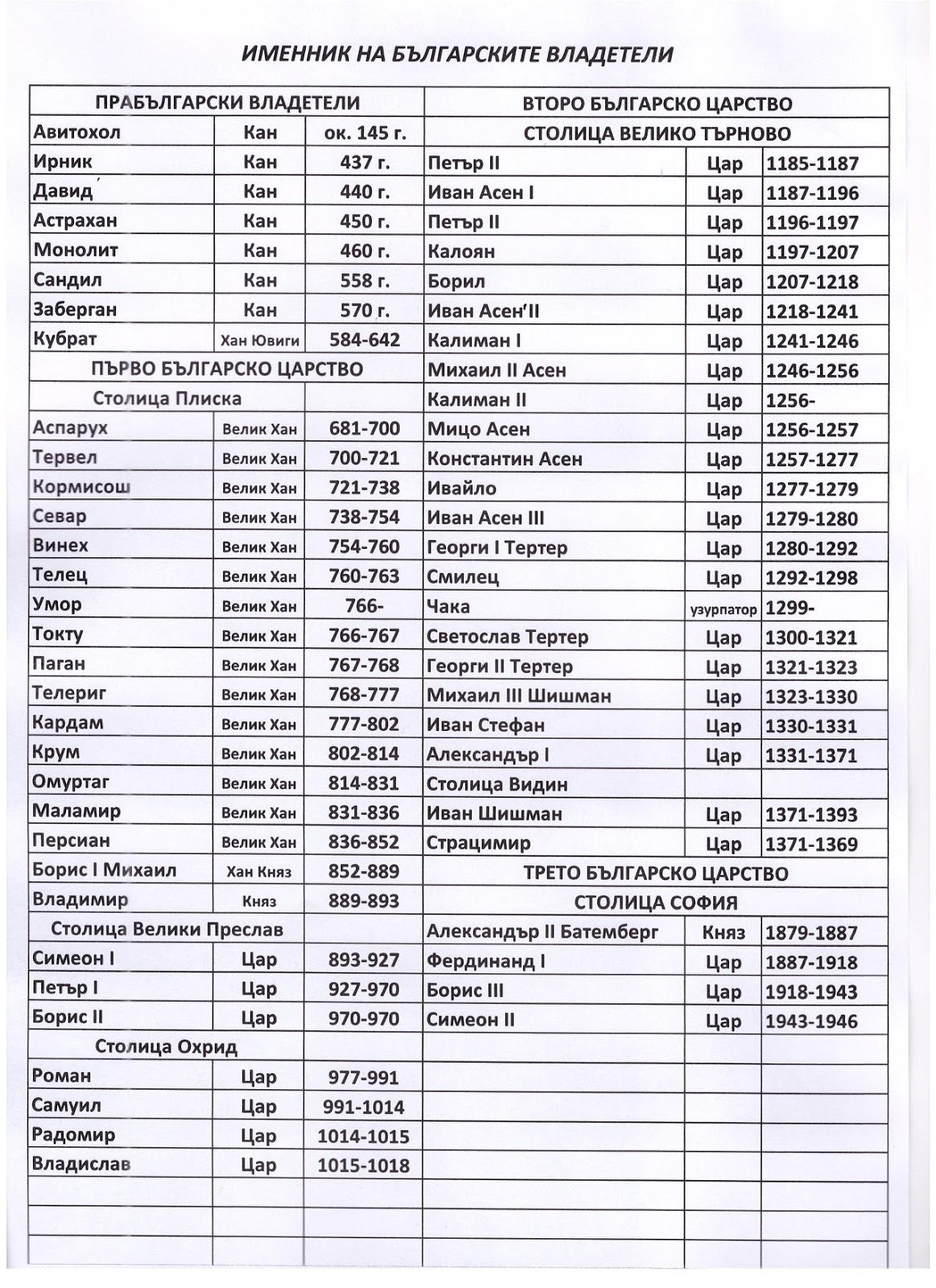 Именник на БЪЛГАРСКИТЕ владетели.Да се знае и помни!