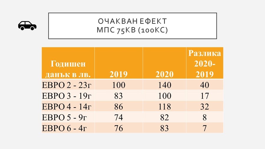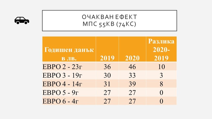 За коли с мощност 74-99 к.с. (55-74 киловата) остава сегашният компонент 0.54. За най-ниската мощност – под 74 к.с. (до 55 киловата) също компонентът от 0.34 остава.