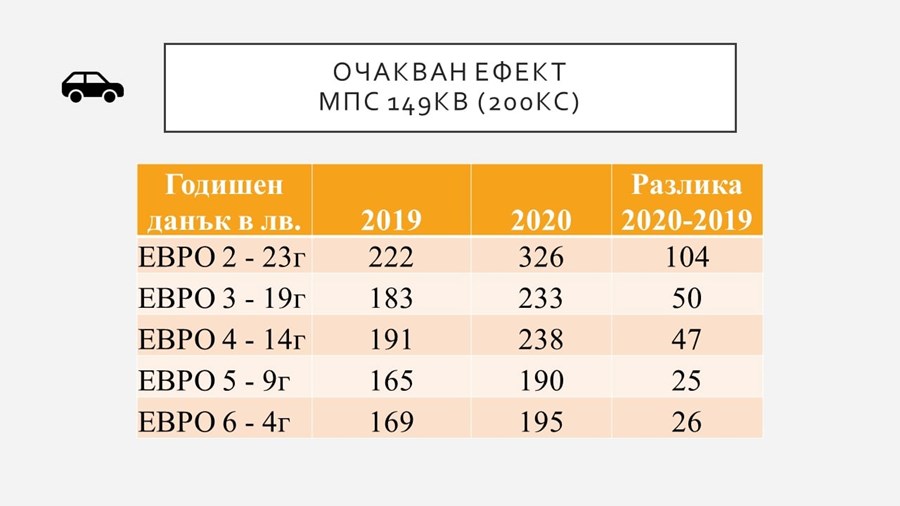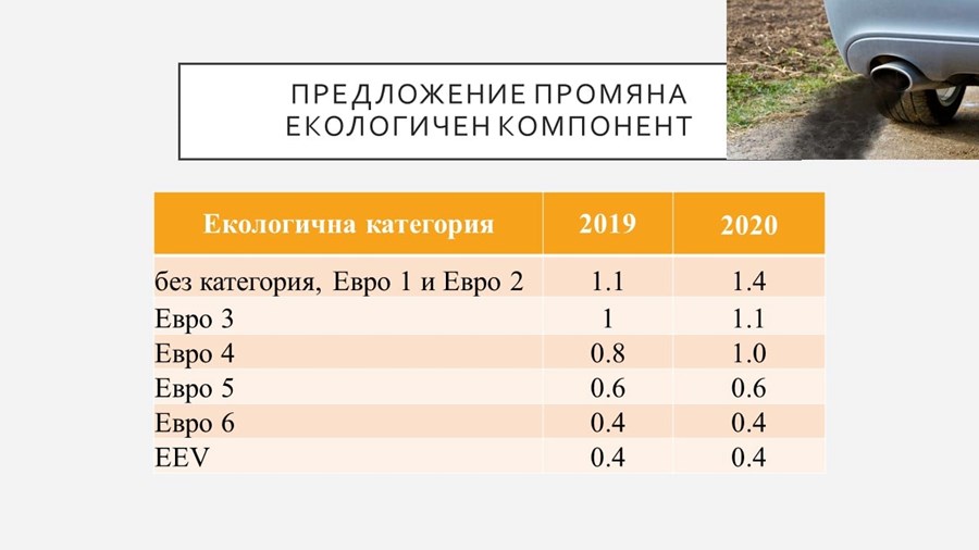 Колите със стандарт Евро 5 и 6 остават със същия данък. Тези с Евро 3 увеличението на коефициента е от 1 на 1.1. За Евро 4 от 0.8 става 1.0. За колите без категория и с Евро 1 и 2 увеличението е най-голямо – от 1.1 на 1.4.