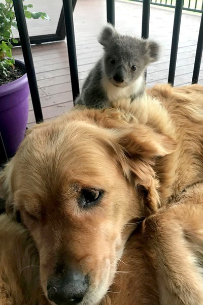 Рано сутринта съпругът й я извикал, за да види нещо - как голдънът им стои отвън с бебе коала на гърба си. Историята е от 2018 година, но чуждите сайтове, отново разказват за нея в контекста на загиващите при пожарите в страната хиляди коали.