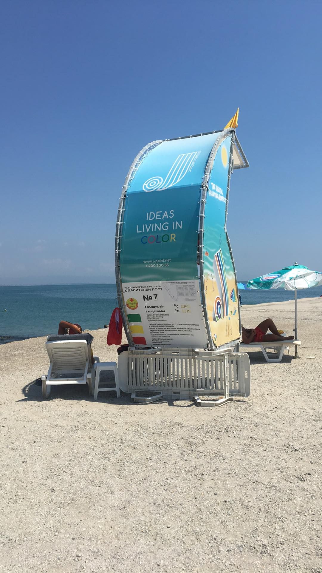 Заради липса на място на плажа, спасителната вишка е поставена на вълнолома.