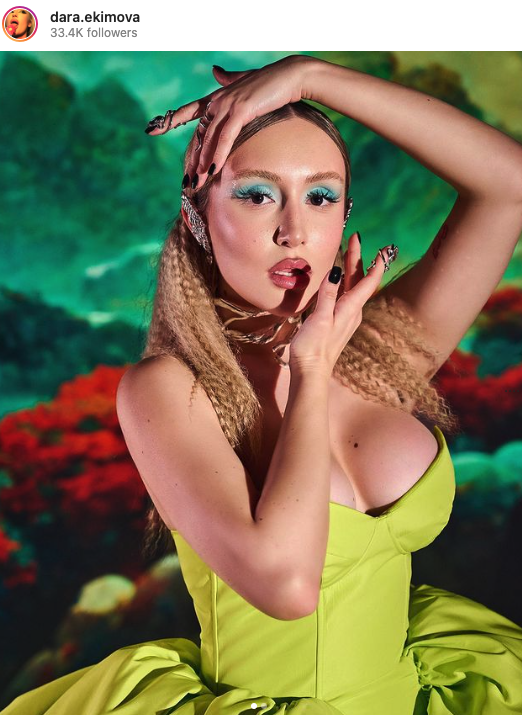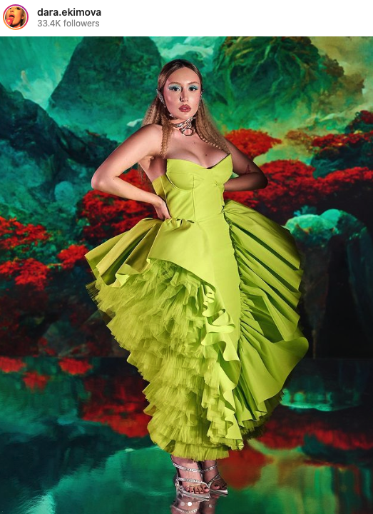 Иновативната дрешка, добре очертаваща пищния й контур, включва елементи от реалния свят и селекция от 3Д тоалети за Метавселената. Дара е доволна, че материята на одеждата е направена чрез процес с нулев текстилен отпадък.
