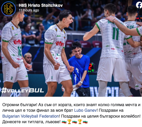 Огромни българи! Аз съм от хората, които знаят колко голяма мечта и лична цел е този финал за моя брат Любо Ганев! Поздрави на Българската федерация! Поздрави на целия български волейбол! Донесете ни титлата, лъвове!