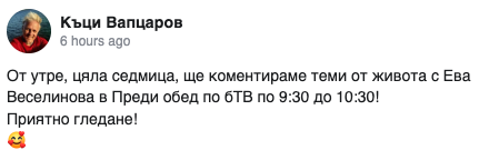 От утре, цяла седмица, ще коментираме теми от живота с Ева Веселинова в Преди обед по бТВ по 9:30 до 10:30!