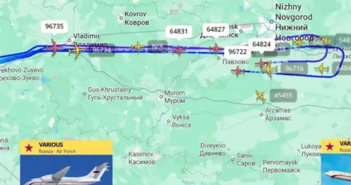 Общо 15 самолета на руските ВВС, включително Илюшин Ил-76МД, Ил-62МК, Ил-96-400ВВИП, Туполев Ту-214ПУ и Антонов Ан-148, излетяха почти едновременно от района на Москва (около 09:00 Централно европейско време), насочвайки се на изток към Нижни Новгород. Това пише Newsweek, цитира Блиц.