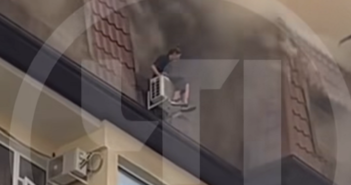 Очевидци и спешен персонал проведоха операция за спасяване на жена, заседнала в пожар на таванския етаж. Тя седеше от външната страна на климатичния блок, избягвайки пожара.