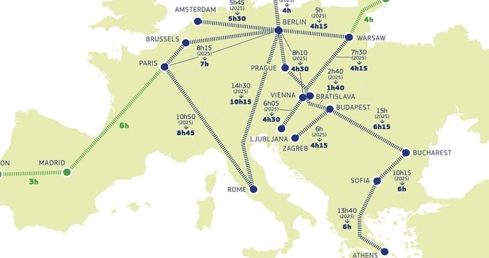 Европейската комисия представи днес амбициозен план за изграждане на мрежа от високоскоростни железопътни линии в Европейския съюз до 2040 година. Сред ключовите трасета е линията между София и Атина, която ще съкрати времето за пътуване от сегашните 13 часа и 40 минути на само 6 часа.