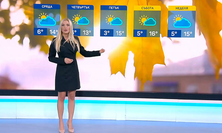 Ще бъде ясен и предимно слънчев ден. Преди обед в източните райони ще бъде облачно, но постепенно облаците ще се разкъсват и ще намаляват, обяви красива руса синоптичка.