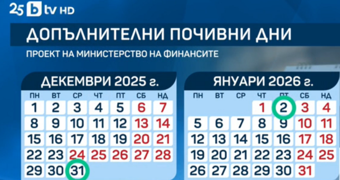 Българите ще разполагат с три последователни почивни дни около настъпването на 2026 г., след като правителството одобри еднократна мярка по предложение на финансовия министър Теменужка Петкова. Обявените за допълнителни почивни дни са 31 декември 2025 г. и 2 януари 2026 г., пише БТВ