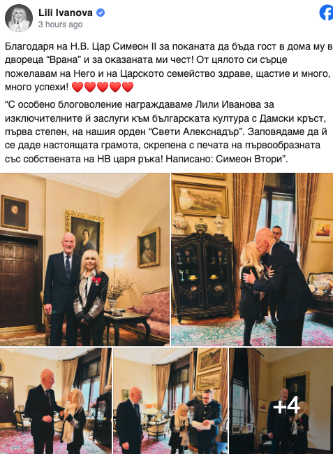 Благодаря на Н.В. Цар Симеон II за поканата да бъда гост в дома му в двореца “Врана” и за оказаната ми чест! От цялото си сърце пожелавам на Него и на Царското семейство здраве, щастие и много, много успехи!, заяви Лили Иванова след срещата.