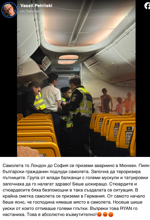 "Започна да тероризира пътниците. Група от млади балканци с големи мускули и татуировки започнаха да го налагат здраво! Беше шокиращо. Стюардите и стюардесите са били безпомощни в така създалата се ситуация. Така в крайна сметка самолетът се е приземил в Германия", написа Петрийски.