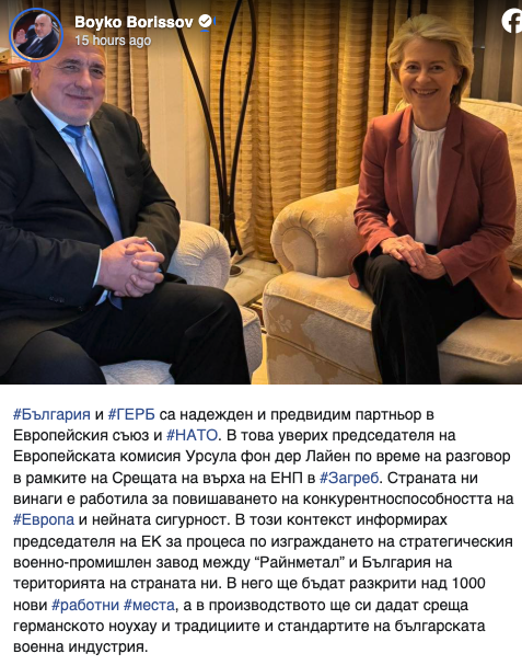 България и ГЕРБ са надежден и предвидим партньор в Европейския съюз и НАТО. В това уверих председателя на Европейската комисия (ЕК) Урсула фон дер Лайен по време на разговор в рамките на Срещата на върха на ЕНП в Загреб, написа лидерът на партията Бойко Борисов в профила си във Фейсбук.