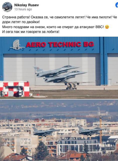 "Странна работа! Оказва се, че самолетите летят! Че има пилоти! Че дори летят по двойки!". Това написа в своя публикация във Фейсбук командирът на ВВС Николай Русев. Поводът за публикацията са българските изтребители, които днес прелетяха в небето над София.