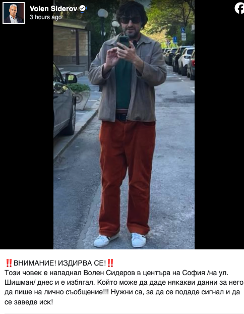 Този човек е нападнал Волен Сидеров в центъра на София /на ул. Шишман/ днес и е избягал.