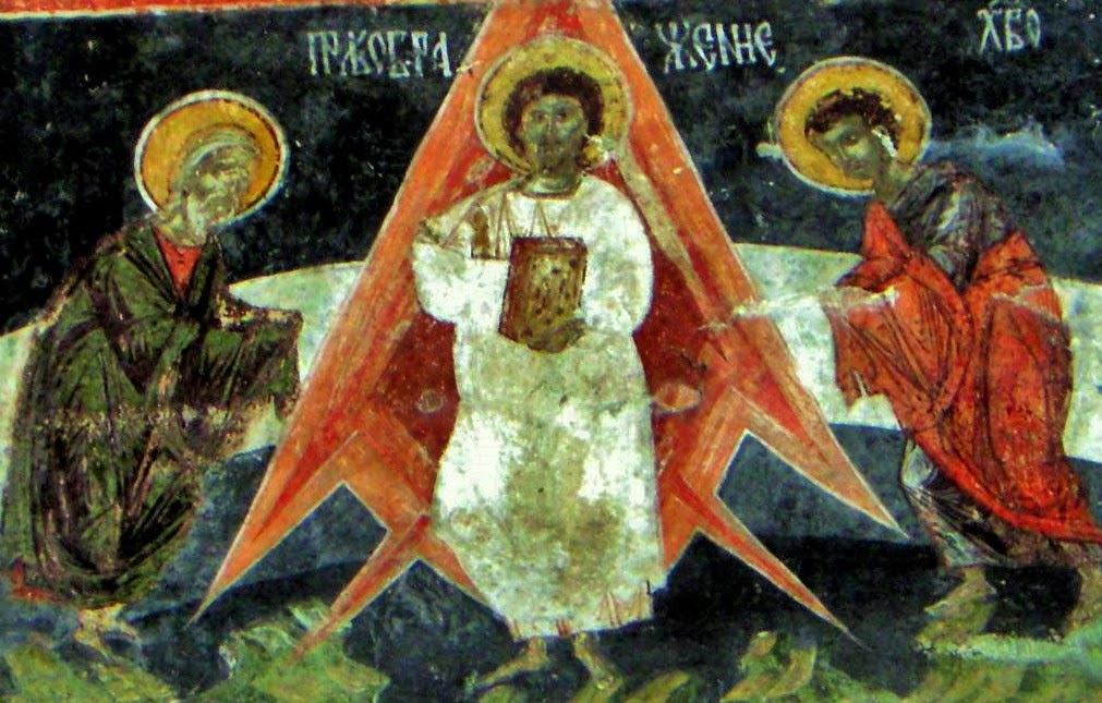 В средния купол проследяваме сюжети от живота на Спасителя. Тук съзираме и прословутия стенопис Преображение, в който Той е представен в готов за излитане космически съд. В южния дял на храма пък, пред невярващите ни погледи, се нижат сцени от свалянето на тялото на Христос от кръста, надгробното ридание и… емблематичната фреска „Слизане в Ада”. В нея Спасителят се спуска в преизподнята с нещо като огнена ракета, за да отвори отново за хората райските двери.