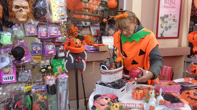 Тематични стоки по сергиите, разбира се - нали е празник на тиквата.