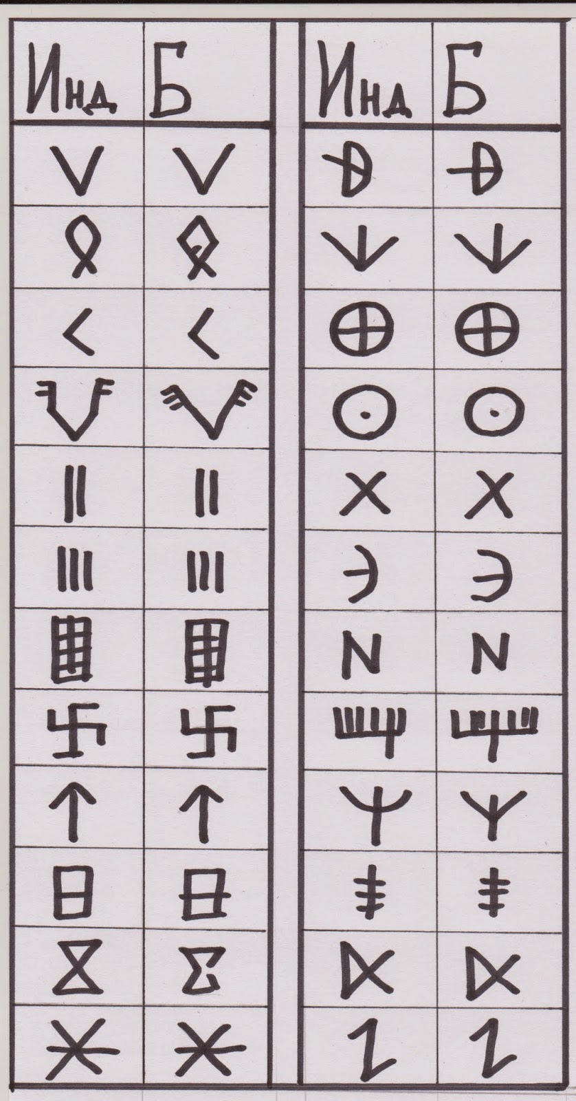 Не само керамиката и оръдията на труда показват връзка с Източна Европа. На територията на Индия през трето хилядолетие преди Христа се появяват особен вид знаци. Около двадесет и четири от тях имат прототипи сред доста по-старата Балканска пименост.