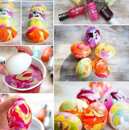 Този път става дума за декориране на яйца с помощта на лакове за нокти в различни цветове по желание. В чаша вода трябва да се поставят няколко капки от дъгата (или повече лакове) и да се смесят с пръчка. След това в чашата се поставя половината яйцето и получавате невероятни ивица.