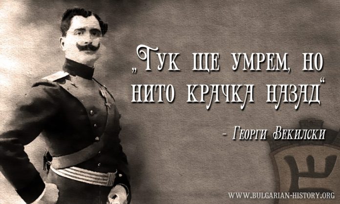 От българска страна, командирът на батареята, младият майор Георги Векилски, решава да вдъхне кураж на своите бойци. Той се отправя към отстъпващите българи и застава пред тях, блед и спокоен, с онова мъжество, което в такава критична ситуация е отредено само на избраните. Пред войниците си той изрича: