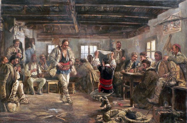 Вглеждайки се внимателно в платното, ще установим, че белодрешкото, който друса шопска ръченица в центъра на композицията, е самият кореспондент на "Таймс" - ирландецът с българско сърце Джеймс Баучер. В духа на академичната школа Мърквичка прави редица предварителни рисунки и ескизи от натура - на интериора, персонажите и детайлите, а картината "сглобява" впоследствие. Творбата е високо оценена още навремето, а и самият автор я е смята за ключова. През 1906 г. създава втори вариант.