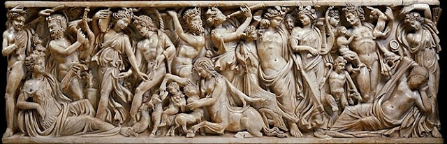 от гуляя следващ тържеството. Царят е возен на колесница (каруца) подобно на Дионис.