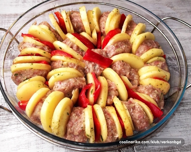 3. В тава за печене, в която предварително сте сложили масло подредете 2-3 кръгчета от картоф, след това сложете кюфте, отново кръгчета картоф, а от време на време