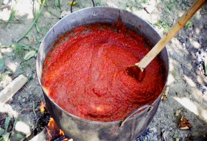 огън.Когато лютеницата заври, се бърка постоянно за да не загори. Добавят се сол