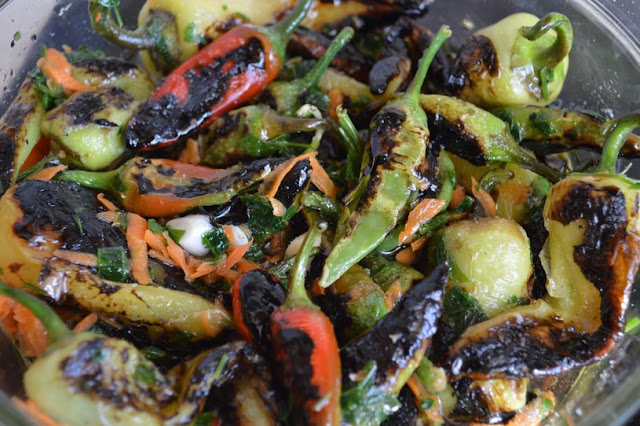 Сипвам оцета в умерено дълбока тенджера преди да започна с чушлетата. После пърля чушлетата на скара и след като са готови, веднага ги махам и ги слагам в съда с оцета. Захлупвам с капак и леко разклащам съда. Слагам нова порция/партида чушлета на скарата. Малко преди да станат готови, изваждам от тенджерата с оцета първата партида и ги слагам в друг захлупен съд.
