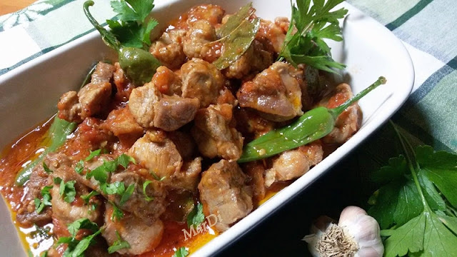 В него са просто едни свински мръвчици с чеснов доматен сосец. Приготвих го, хареса ми и пак ще го направя, защото обожавам всичко, в което има чесън.