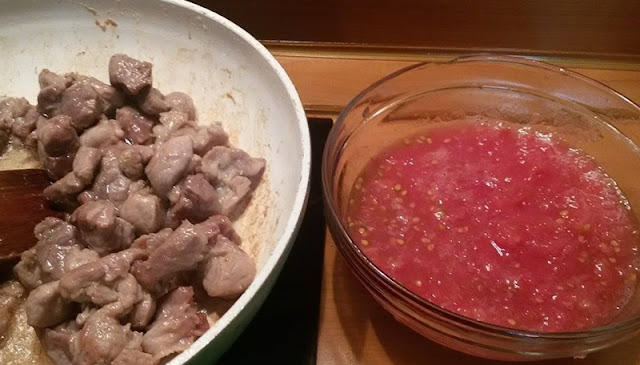 Месото се нарязва на парченца и се изпържва в тиган от всички страни. Изважда се и в същата мазнина се слагат настърганите или пасирани домати, но обелени.