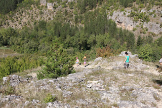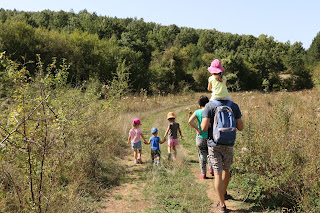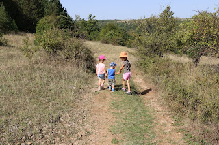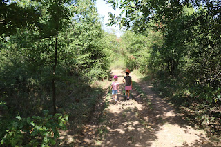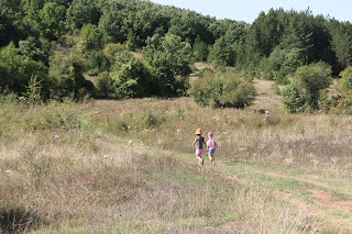 Пътеката първоначално върви през отркрито преди да навлизе в гориста местност. Децата с радост приеха идеята да ни бъдат водачи :-)