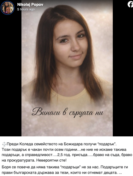 Бащата на Сияна Николай Попов написа силен пост в социалната мрежа. Преди Коледа семейството на Божидара получи “подарък”, пише той.